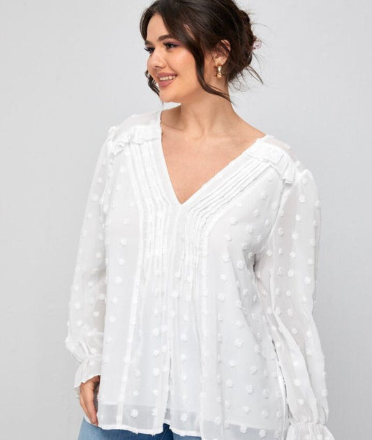 Plus Swiss Dot Plicated Flounce Sleeve Blouse
