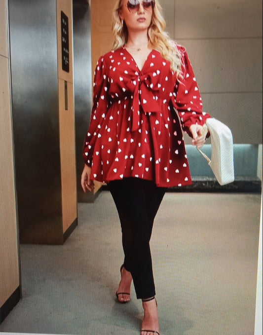 Plus Heart Print Bow Tie Blouse