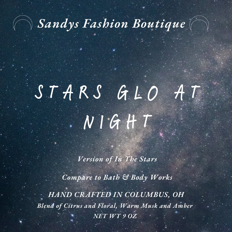 Illuminate your evenings with the Stars Glo at Night Candle. Made with hand-poured, eco-friendly soy wax and scented with warm, and soothing aroma. Candle not only creates a peaceful ambiance but also contributes to a sustainable planet. Watch as the stars glow in the soft, flickering light of this beautiful candle. Compare to Bath & Body Works.